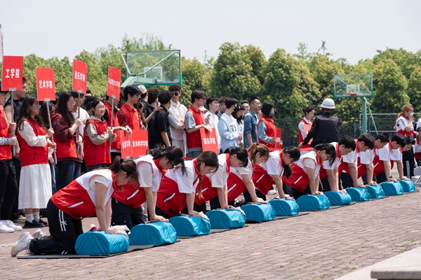 此次演练以地震灾害来临为模拟场景,中午12时30分伴随校园响起急促的警报声正式拉开帷幕,参演师生按照演练预案,根据工作人员指令快速有序从学生公寓区疏散到安全区域。消防救援队模拟了火灾场景,演练了如何接消防水带、火情扑救、灭火器使用等。医学院(护理学院)的师生志愿者们进行了应急救护知识培训,现场展示心肺复苏、创伤救护等实用技能。